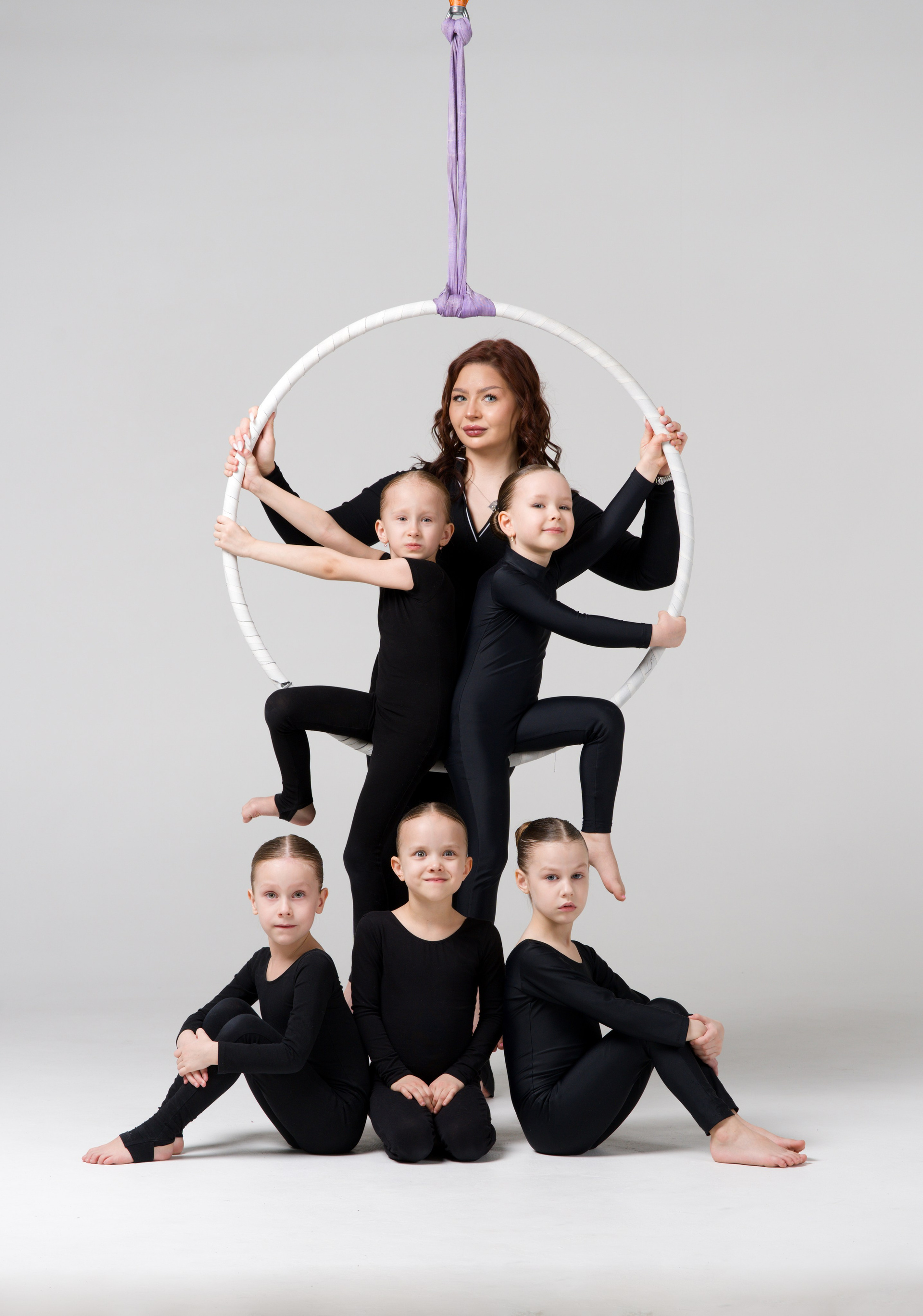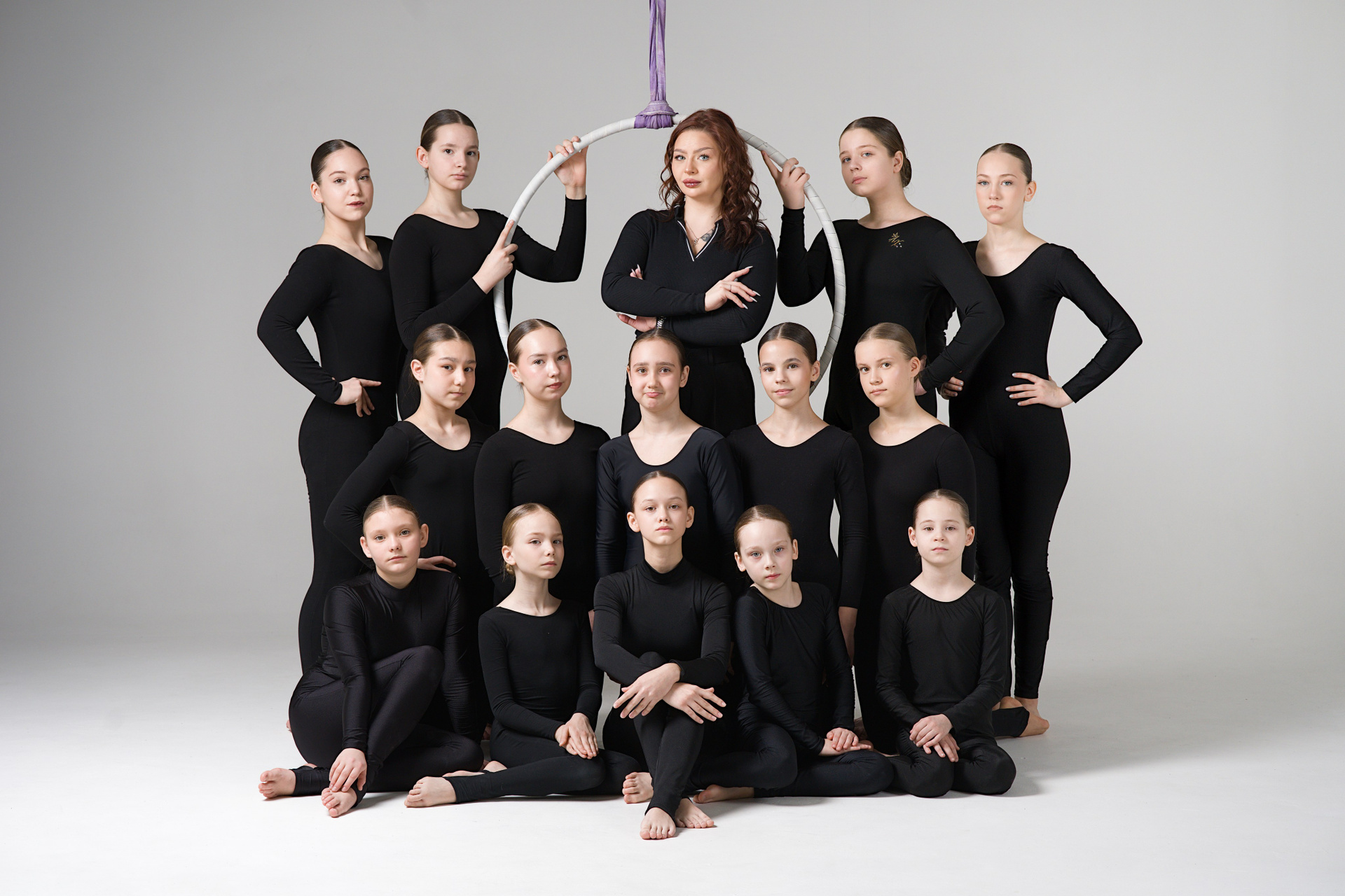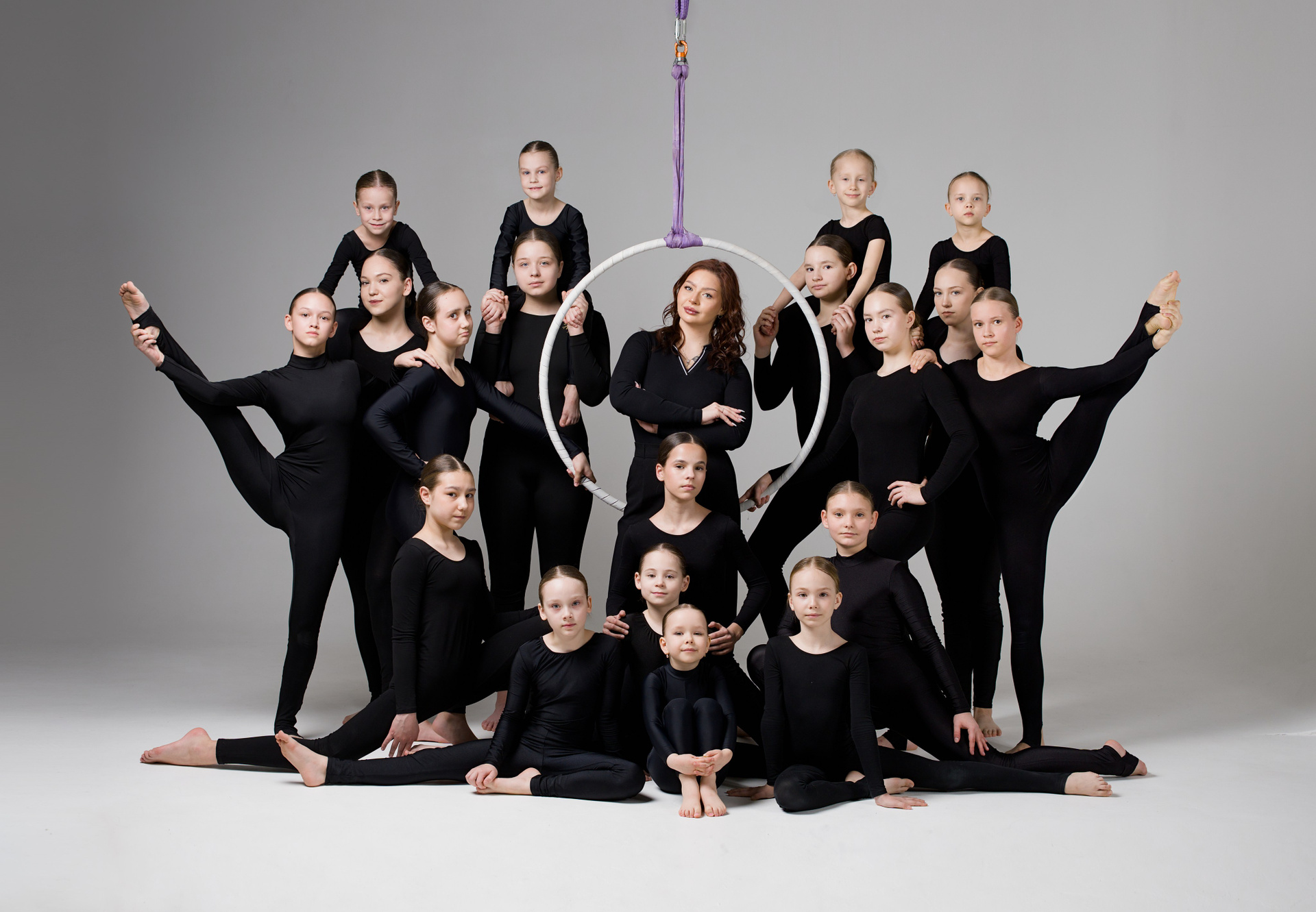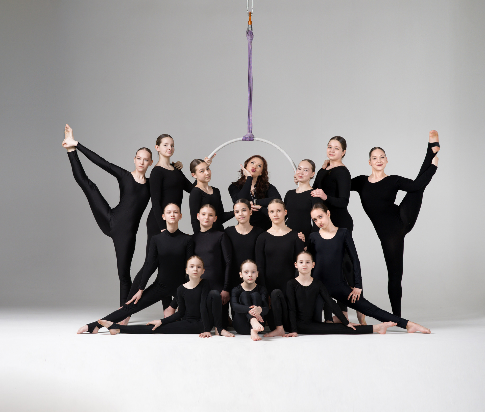 Групповой портрет 19 спортсменов по воздушной гимнастике с тренером. Съемка в стиле минимализм на белой циклораме.