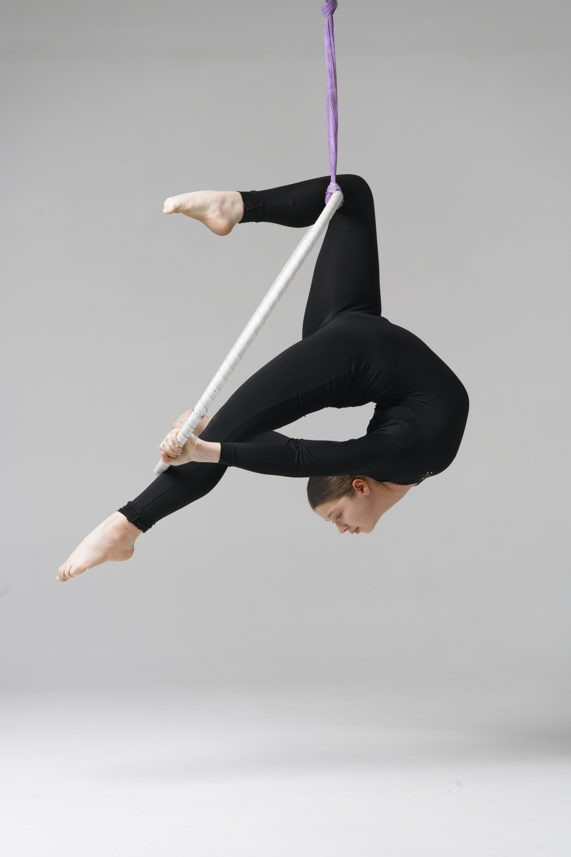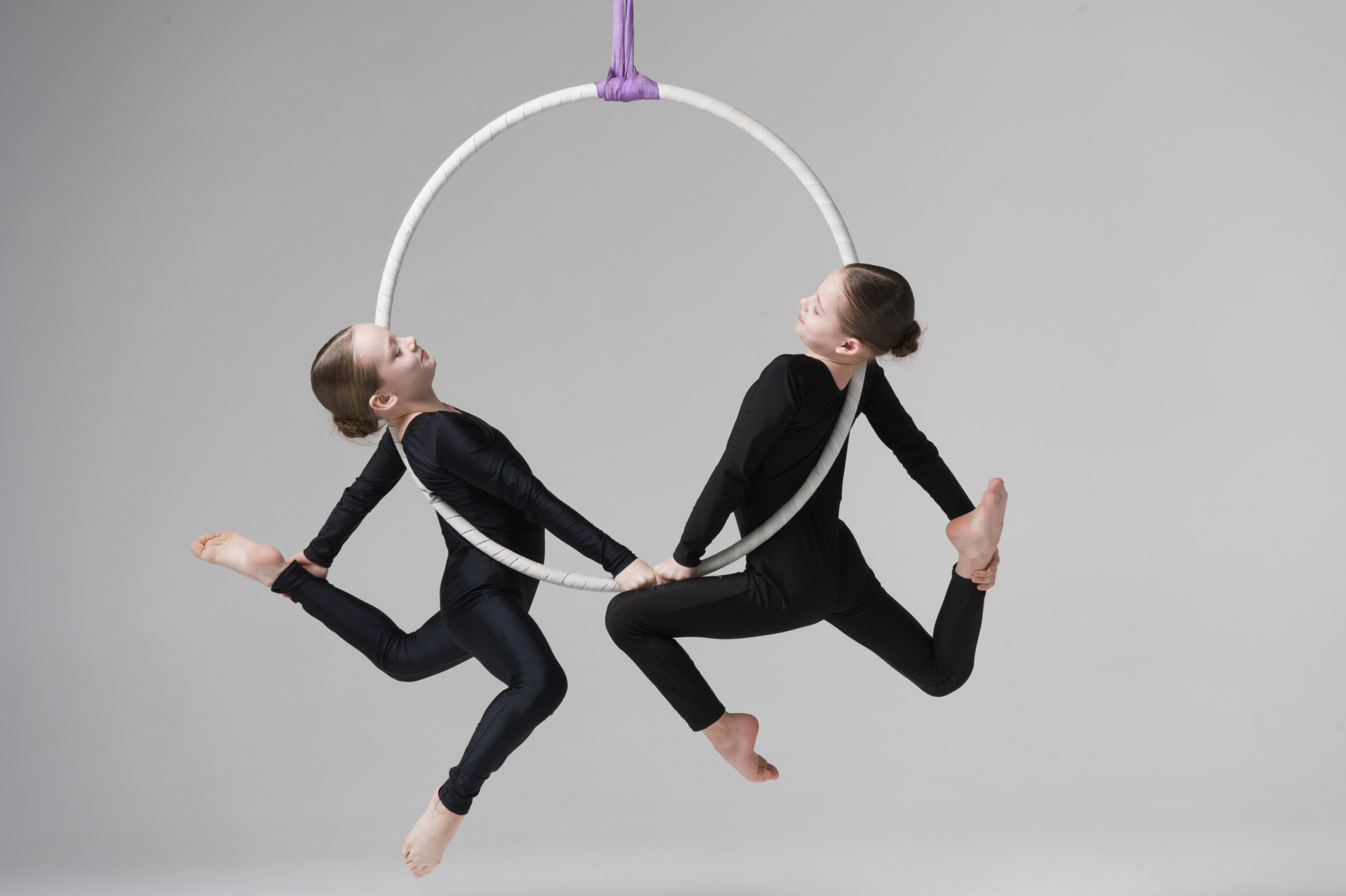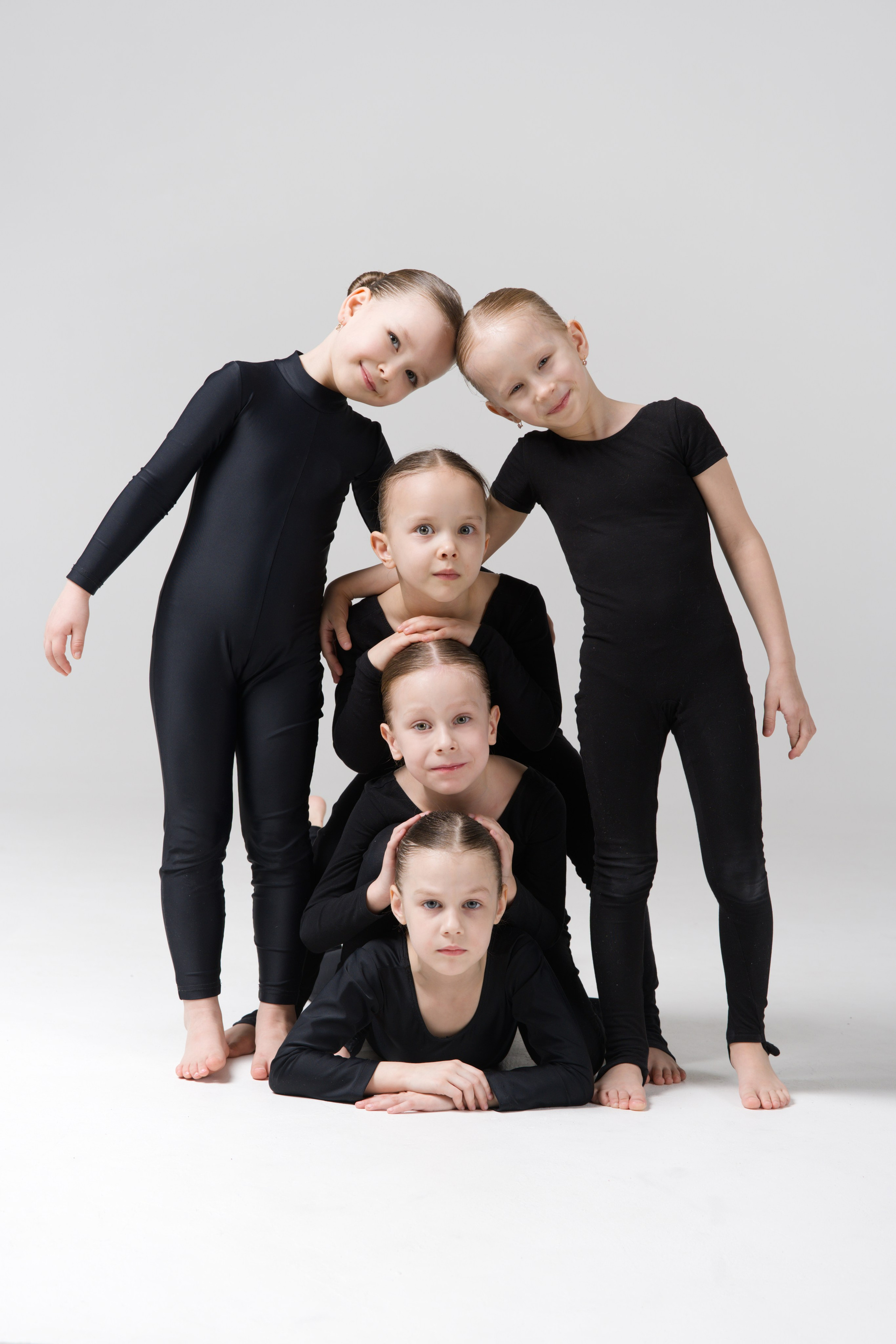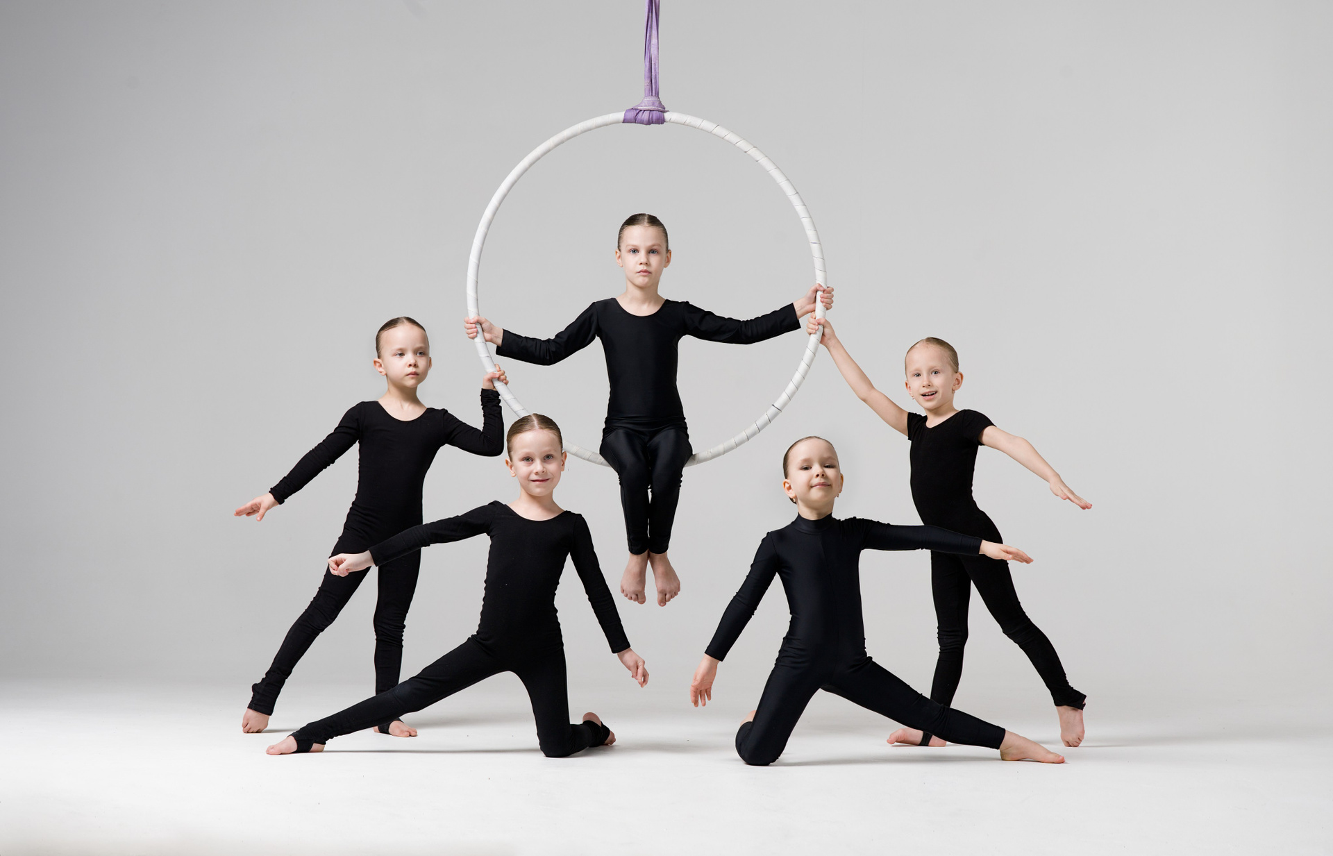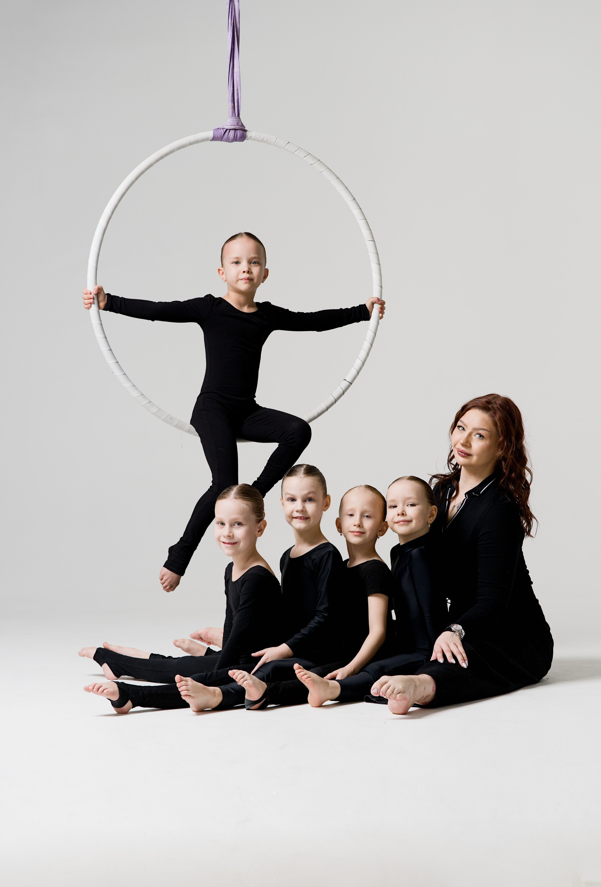 Групповой портрет 19 спортсменов по воздушной гимнастике с тренером. Съемка в стиле минимализм на белой циклораме.